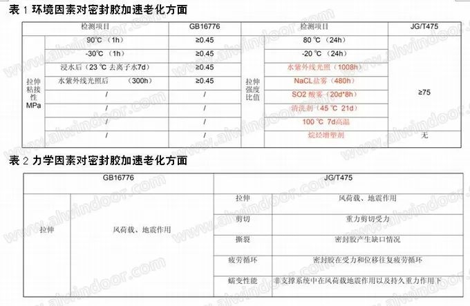 選用結(jié)構(gòu)膠主要考慮的因素為粘接性,拉伸強(qiáng)度,最大拉伸強(qiáng)度時(shí)伸長(zhǎng)率以及耐久性。前三個(gè)因素在GB16776-2005中規(guī)定嚴(yán)格,但硅酮結(jié)構(gòu)膠在使用過(guò)程中不可避免的要受到紫外線、冷熱、鹽霧、機(jī)械應(yīng)力、腐蝕等外界環(huán)境因素的影響,使得結(jié)構(gòu)膠性能變差,慢慢喪失其應(yīng)起作用。國(guó)家通過(guò)參考ETAG 002《結(jié)構(gòu)密封膠裝配系統(tǒng)技術(shù)審核指南》新制定了JG/T475-2015《建筑幕墻用硅酮結(jié)構(gòu)膠密封膠》,其中引入了鹽霧、酸霧、清潔劑老化試驗(yàn)(表1環(huán)境因素對(duì)密封膠加速老化方面),增加了撕裂、蠕變等力學(xué)性能的變化檢測(cè)(表2力學(xué)因素對(duì)密封膠加速老化方面)。在評(píng)價(jià)硅酮膠老化后性能時(shí),不僅要求其性能指標(biāo)不小于某一值,而且要求性能的衰減不能過(guò)快,至少要保持標(biāo)準(zhǔn)條件下性能的75%。因此我們?cè)谶x用結(jié)構(gòu)膠時(shí)不僅考慮安全性,耐久性也是重要指標(biāo)之一,否則造成玻璃幕墻安全隱患。